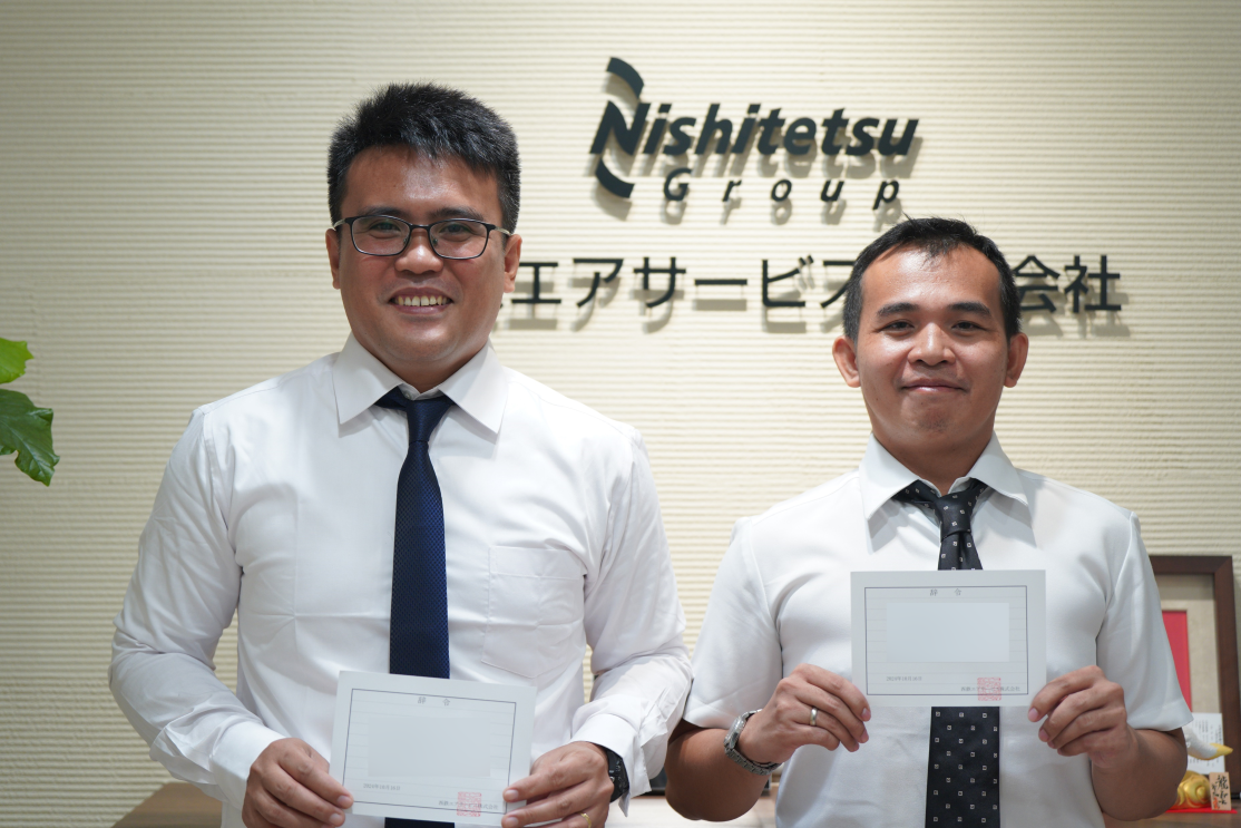 2024年10月16日(水)、福岡空港を中心に日本全国の9空港において空港ハンドリング事業を展開している西鉄エアサービス株式会社に、PERSOL Global Workforceの紹介でフィリピンの特定技能・航空分野の外国人材2名が入社しました。入社に伴い、本社オフィスにて当日「辞令交付式」が開催されました。