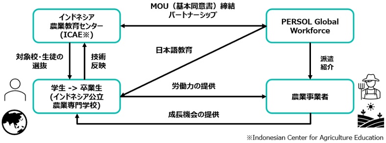 本プロジェクトを通じて、インドネシアの農業系公立学校の卒業生は、在留資格「特定技能」の農業分野の人材として来日・就業する予定です。インドネシア農業省の傘下で技術政策の策定と農業教育の実施を担う農業教育センターが本プロジェクトに参加する学校および学生の選抜を担当します。PERSOL Global Workforceは卒業生の在留資格獲得および今後日本ではたらくうえで必要な日本語習得に向けて、日本語教育を実施します。また、日本での就業(派遣、人材紹介)から、職場・地域に定着するためのサポートも行います。農業系公立学校の卒業生は、特定技能・農業の外国人材として来日し、日本の農業事業者のもと就業し、さらなる技術獲得と多様な経験からの成長を目指すこととなります。