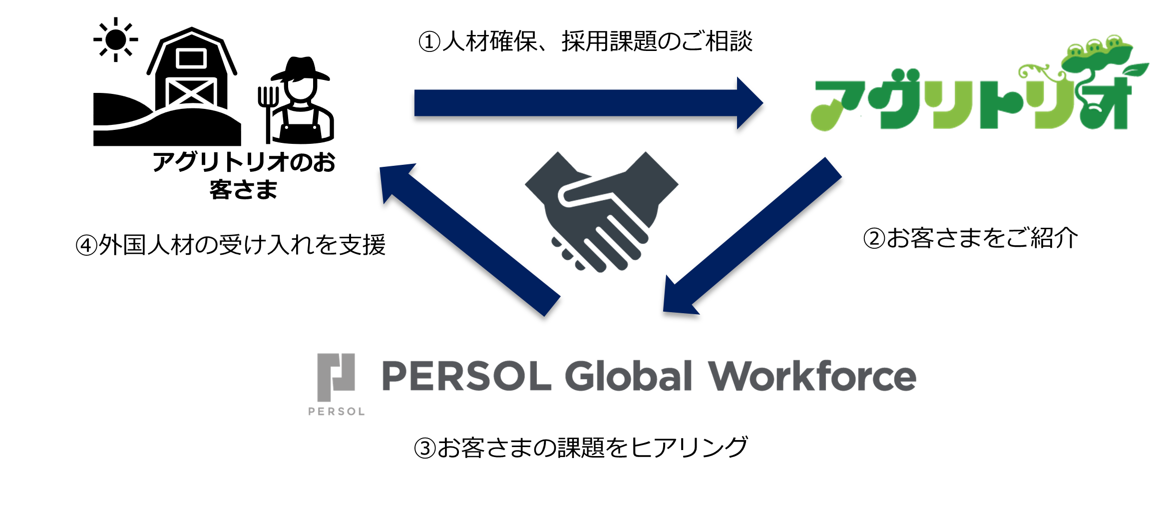 本業務提携は、アグリトリオのお客さまが抱える外国人材の受け入れ・定着などに関する課題に合わせ、PERSOL Global Workforceの外国人材に関する各種サービス(派遣、紹介、定着など)を提案・提供するものです。