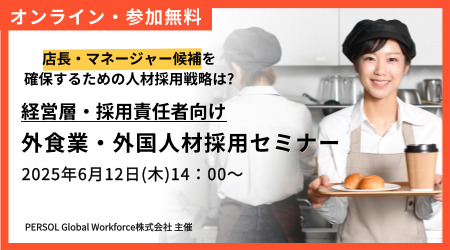 パーソルグループで外国人材に特化した人材サービスを提供するPERSOL Global Workforce(パーソル グローバルワークフォース)株式会社(本社:東京都港区、代表取締役社長:多田 盛弘)は、2025年6月12日(木)に外食業向けに「特定技能・外国人材採用セミナー」を開催します。人材不足の深刻化・慢性化で悩まれている外食業の経営層・採用責任者の方はぜひご参加ください。