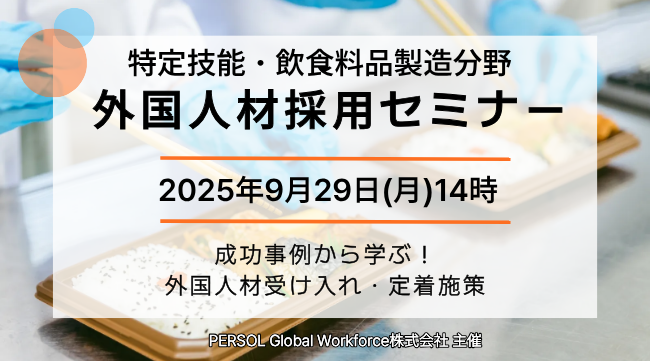 パーソルグループで外国人材に特化した人材サービスを提供するPERSOL Global Workforce(パーソル グローバルワークフォース)株式会社(本社:東京都港区、代表取締役社長:多田 盛弘)は、2025年9月29日(月)に飲食料品製造業向けの外国人材受け入れ・定着に関するオンラインセミナーを開催します。外国人材の採用に興味はあるが、ノウハウ不足や漠然とした不安で悩んでいる方、すでに採用経験はあるものの定着に課題を感じているご担当者さまは、ぜひご参加ください。