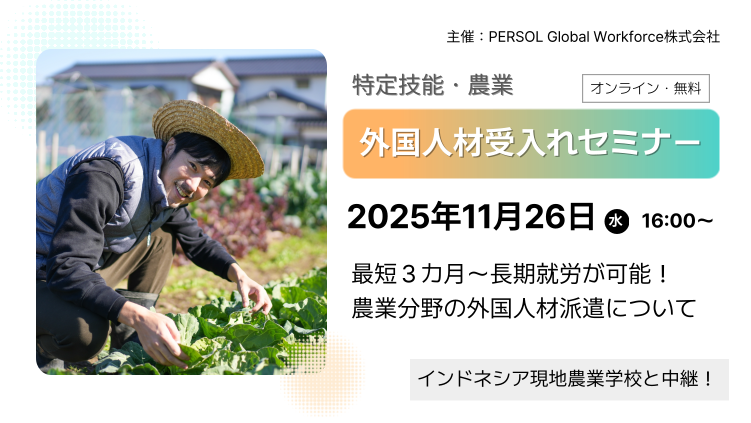 パーソルグループで外国人材に特化した人材サービスを提供するPERSOL Global Workforce(パーソル グローバルワークフォース)株式会社(本社:東京都港区、代表取締役社長:多田 盛弘)は、2025年11月26日(水)特定技能・農業分野における「外国人材受入れセミナー」を開催します。労働力不足で悩まれている、農業事業者、農業関係者はぜひご参加ください。なお、本セミナーは無料です。